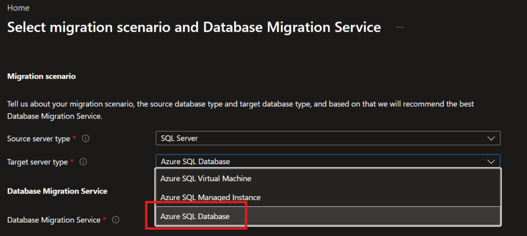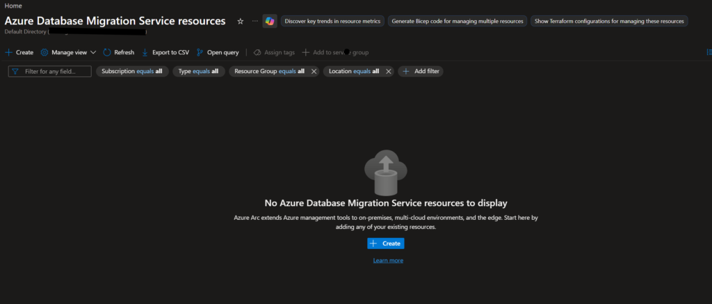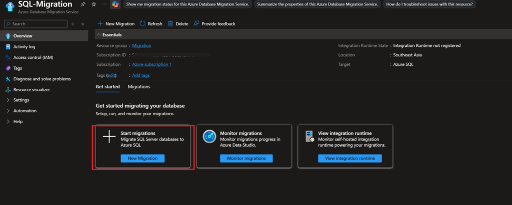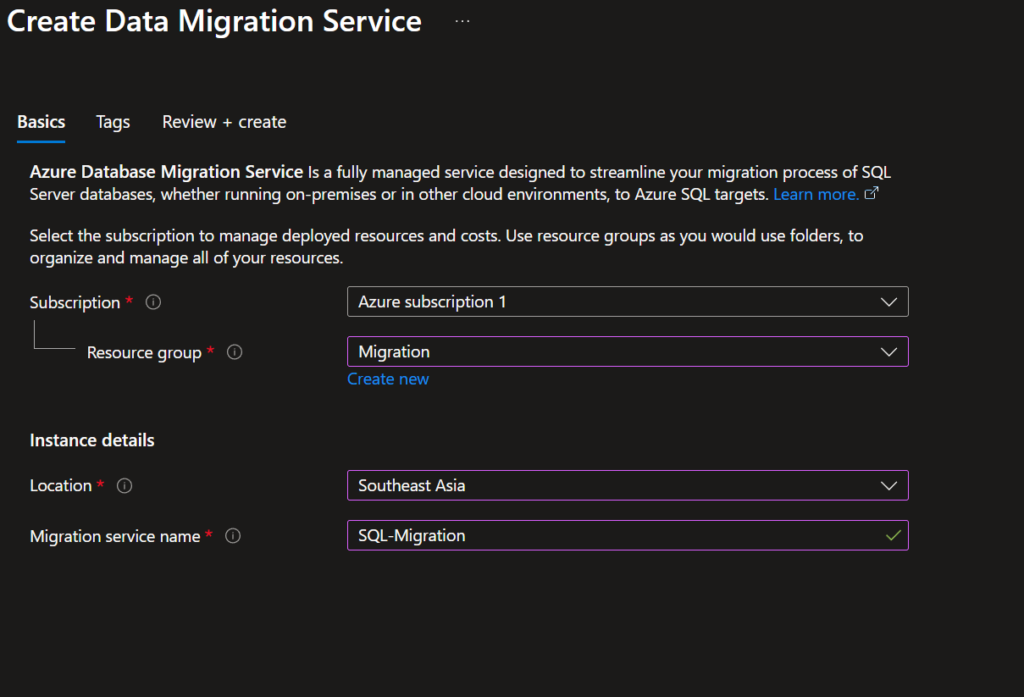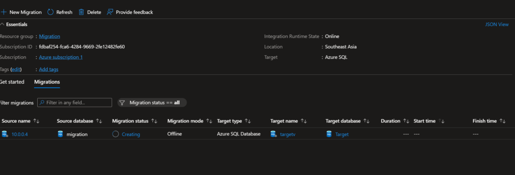 - Create Azure Database Migration Service.