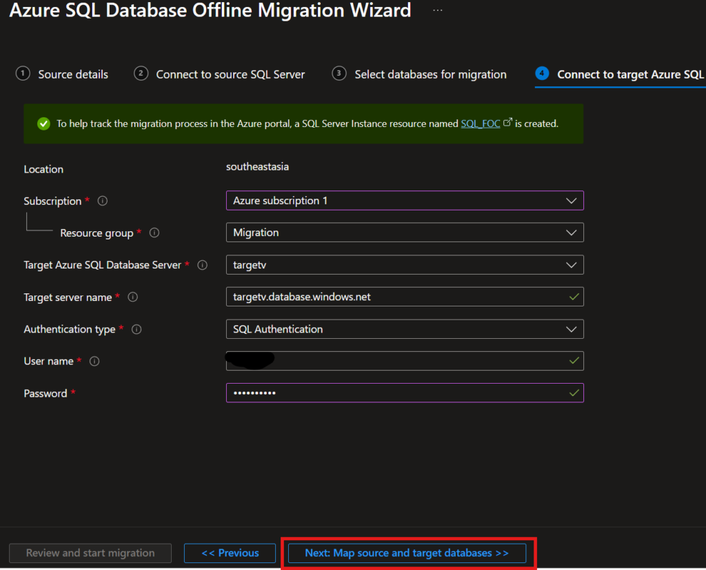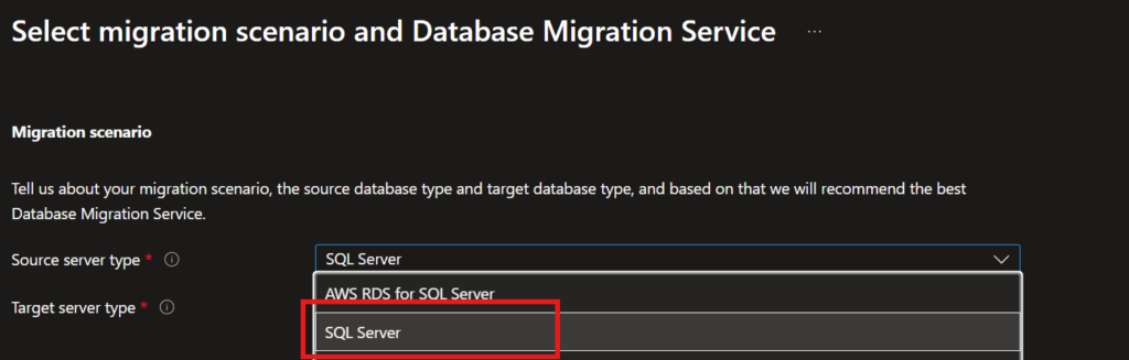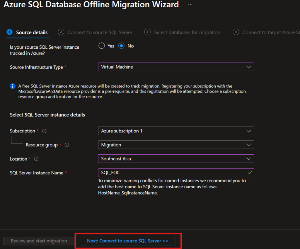 The free SQL Server instance is automatically deployed by Azure DMS as a migration tracking and metadata database when you select “Virtual Machine” as the source infrastructure type. Provide name for Free SQL server instace here.