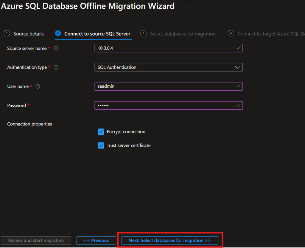 10. Connect the source server by providing credentials.