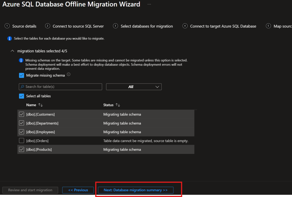 In this window, you can select the tables to be migrated to the target database. Empty tables can’t be migrated.